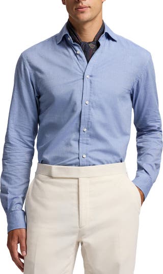 An ultrafine herringbone weave brings subtle texture to this long-sleeve button-up shirt done in a versatile pale blue.