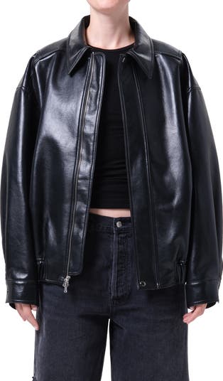 Roomy sleeves and dropped shoulders play up the relaxed, retro attitude of this outfit-making leather jacket.