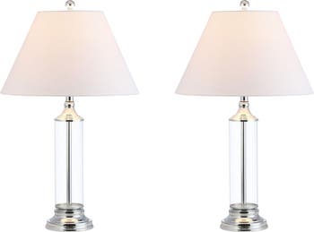 Drawing inspiration from classic architectural crown molding, the curvature to the metalwork on this traditional column lamp gets a modern update in gleaming chrome. Paired with a glass center and chrome router to conceal the electrical components, the transitional look is completed with a tapered linen shade. With matching finial and silk-wrapped cord, each detail on this set of two lamps was considered for timeless style.