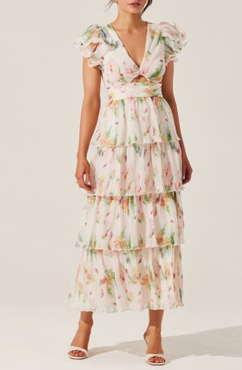 Tiered ruffles add playful movement to a romantic dress crafted from softly crinkled fabric with a cutout at the waist.