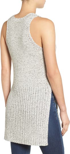 Marled threads create textural interest on a long sleeveless sweater that's split at the hem.