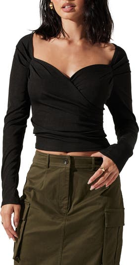 A sweetheart neckline tops this gorgeous jersey top fashioned in a fabulous faux-wrap silhouette that highlights your curves.