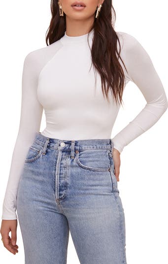 A twisty strap separates the open back of a long-sleeve bodysuit styled with a mock neck.