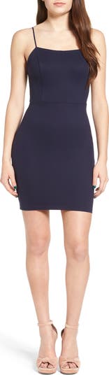 Smooth stretch ponte hugs your curves and flaunts skin above and below in this flirty minidress with adjustable spaghetti straps.