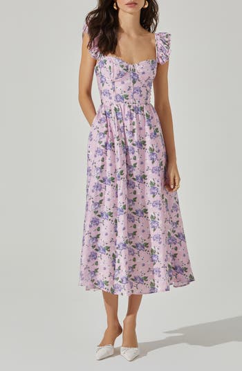 A structured bodice provides a perfect contrast to the flowy A-line skirt of a fresh and flowery dress complete with corset-inspired back lacing.