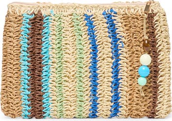 A beaded zipper pull and colorful stripes highlight the intricately woven raffia of a slender clutch perfect for securing your small on-the-go essentials.