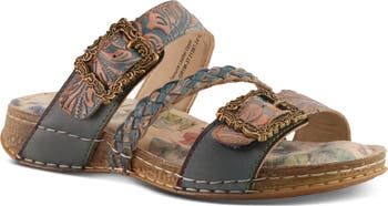 A duo of adjustable straps offer a customized fit on a mixed-media leather slide sandal featuring hand-painted floral patterns and grounded by a plush footbed.