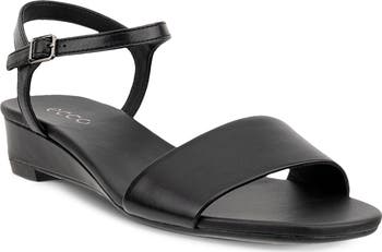 A low wedge heel brings subtle height to a two-piece leather sandal featuring premium underfoot cushioning and an adjustable strap at the ankle.