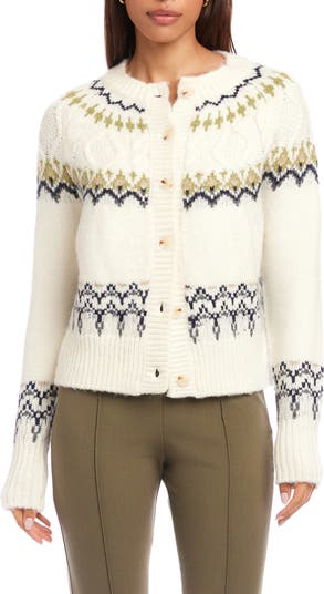 A wintry Fair Isle pattern brings warmth and charm to this wool-kissed cardigan that's anchored by ribbed trim.