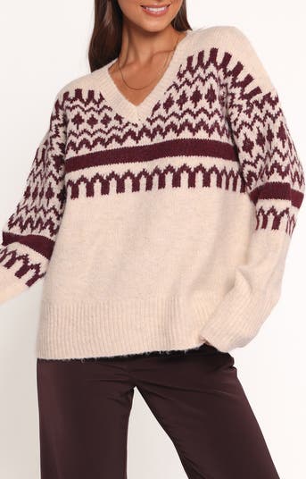 Snuggle into the roomy fit of a wool-kissed sweater splashed with a classic pattern.