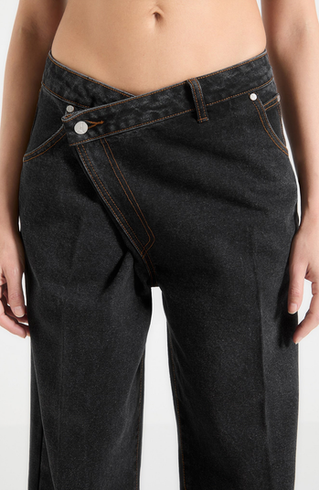 These Wrapover Wide Leg Jeans feature a wrapover waistband and full-length crease, offering a contemporary, comfortable fit. Crafted from 18oz denim, they are detailed with contrast stitching for added sophistication.