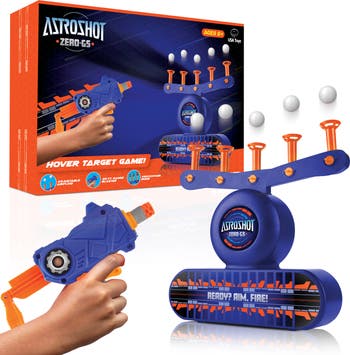 COMPLETE SHOOTING TARGETS GAME KIT: The Astroshot Zero GS multi player target shooting game set includes 1 target shooting gallery, foam dart gun, 10 hovering ball targets, 10 foam darts, and 5 knockdown targets; compatible with Nerf guns, targets, and accessories FLOATING BALL TARGET PRACTICE FOR KIDS: Load each toy gun with 1 soft foam dart at a time, cock, aim, and knockdown all gun targets from up to a 25ft shooting range; turn the knob to adjust the air stream and make the hovering targets float higher or lower 2 WAYS TO PLAY: Flip the switch on the module to activate the floating ball targets or install the flip targets, load your blaster toy gun with a foam dart, cock the firing hammer, aim, and shoot; easy-to-load blaster guns hold an extra foam dart on top DURABLE INDOOR TOY SPECS: Practice target shooting gallery measures 11.25" L x 3" W x 12.75" H; powered by 4 (AA) batteries (not included) or with the included USB cable; this indoor target game is safe for kids ages 6+ KID-SAFE AND QUALITY ASSURED: The AstroShot Zero GS is great for solo play or for playing with family and friends