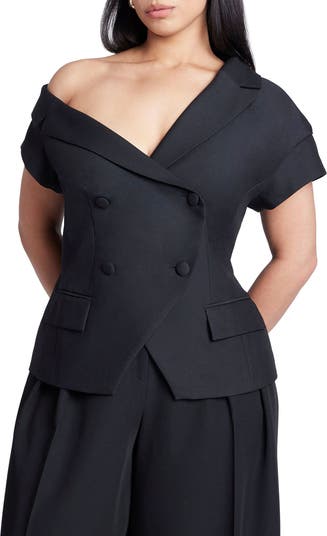 A fresh slant on suiting style defines a night-out top softly slung off one shoulder.