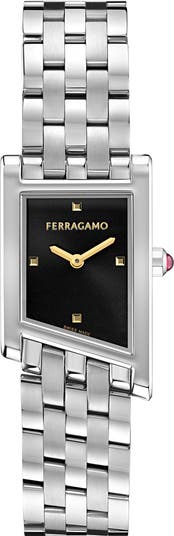 An asymmetric case lends contemporary edge to an elegant bracelet watch featuring a clean, minimalist dial and gleaming square markers for geometric intrigue.
