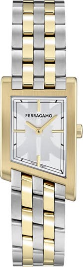 An asymmetric case and logo-accented guilloche dial add bold edge and dimension to an architectural watch featuring slim markers and a two-tone bracelet.