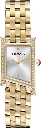 Brilliant rows of diamonds flank the asymmetric case of this intriguing bracelet watch featuring more diamonds on the minimalist sunray dial.