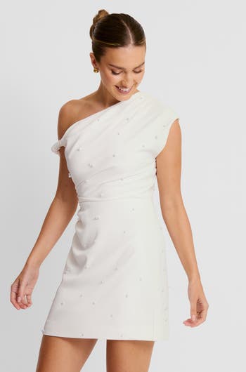 Sculpted one-shoulder mini adorned with scattered pearls, graceful drape, and a confident party-ready silhouette.