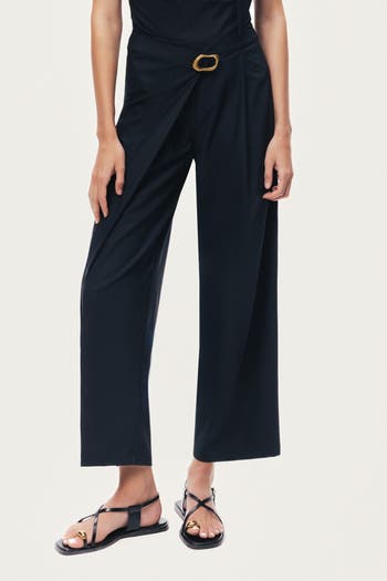 A refined pair of tailored pants featuring an asymmetric waistline accented with a sculptural buckle detail. Designed with a clean silhouette that elongates the leg, this style transitions effortlessly from day to evening with a modern, polished finish.