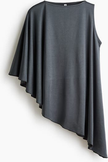Oversized top in interlock jersey with a boat neckline, a cape sleeve on one side and an asymmetric hem.