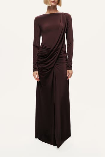 Elegantly fluid and alluring, this full-length dress features a bateau neckline and long sleeves balanced by an open scoop back with ruched detailing. The asymmetric draped front and gathered waist create a sculpted, flattering shape, while the thigh-high slit adds a modern, confident edge. Designed to skim the body with effortless grace, it embodies timeless evening sophistication.