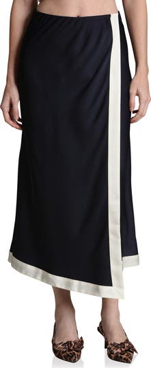 Crisply contrasting trim pops along the edges of this faux-wrap midi skirt.
