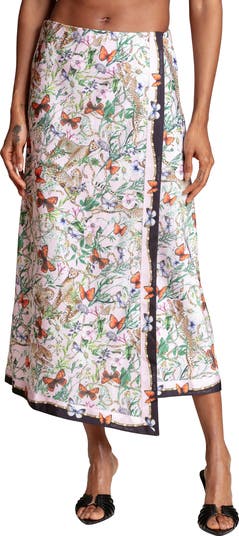Crisply contrasting trim pops along the edges of this faux-wrap midi skirt.