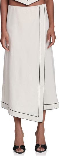Inky piping outlines this lightweight linen-kissed midi skirt made with a sharp asymmetric hem.