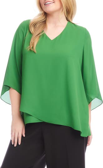 A front crossover hem dips lower in back to enhance the fluid movement of this silky crepe top framed by fluttery sleeves.
