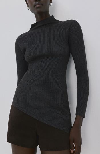 An asymmetric hemline lends modern edge to this ribbed mock-neck sweater designed with a sleek, elongated silhouette.