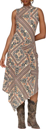 A vibrant tile print accentuates the asymmetric hem of this breezy, curve-skimming dress complete with a classic mock neckline.