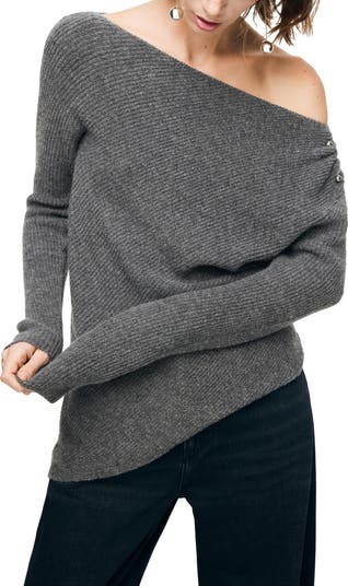 Metal hardware threads through the neckline of this versatile wool-kissed sweater that can be worn on or off the shoulders.