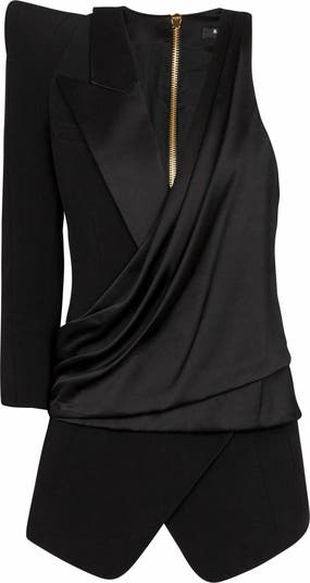 Asymmetric jacket with structured shoulder Deep V-neckline Italian tailored half collar Tone-on-tone satin lapels Draped satin panel Pagoda shoulder Long sleeve Straight cuff with 5 "Double Chain Lion" buttons in gold metal Visible gold metal zip fastening on the back with Balmain Paris-engraved slider Twill lining Short slim fit Model measures 178cm and wears a size 36 Main material: 100% viscose Made in Slovakia Item: EF0AQ120MF01 100% of the viscose fibres used to make this garment come from certified, sustainably managed forests