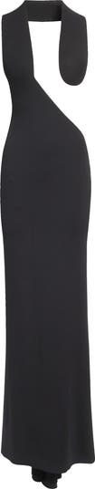 This daring asymmetric gown is sculpted with a plunging front cutout that sweeps into a low-dipping open back. It's fashioned from drapey jersey that trails softly behind in a puddle train.