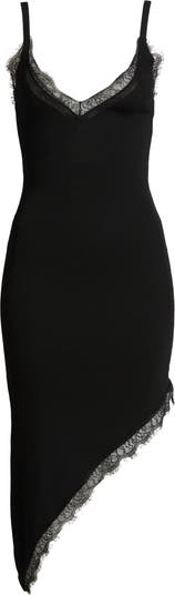This ribbed slipdress is knit in a body-hugging fit with a dramatic diagonal hemline. It's trimmed at the neck and hem with delicate scalloped eyelash lace for a sultry lingerie look.