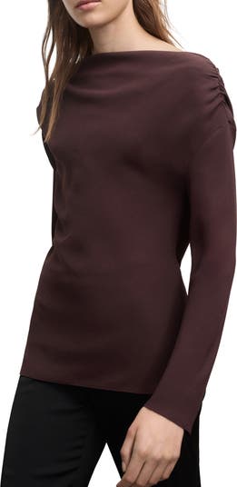 An asymmetric neckline gives an air of edginess to this long-sleeve top made with pleats at the shoulder.