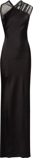 Taking a nuanced approach to eveningwear, the London designer enhances this silky trumpet gown with airy asymmetric mesh panels that fold over the neckline and down the sheer back.