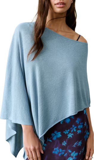 Shimmering metallic threads add touches of elegance to drapey knit poncho made with a wide neckline that dips off the shoulder.