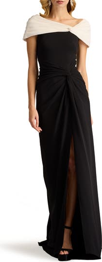 Beloved black-and-white tells a timeless style story for this quietly elegant gown designed with an off-center neckline and a puddling train.