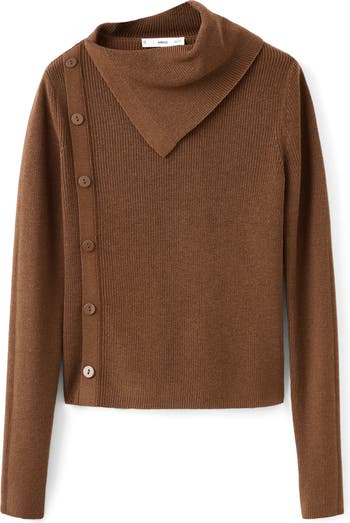 An asymmetric neck and off-center button trim put a contemporary-chic spin on this lightweight and versatile sweater.
