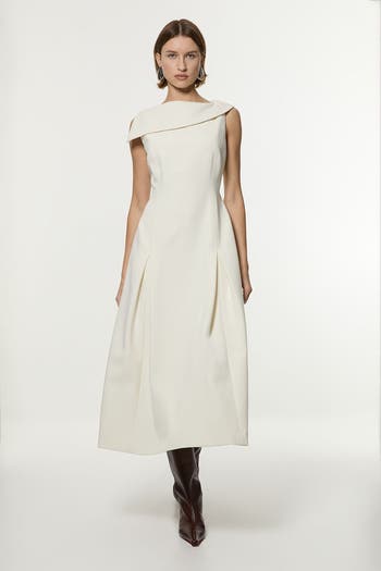 Sculptural asymmetric neckline, tailored bodice and sweeping midi skirt form a commanding evening silhouette that flatters movement and presence.
