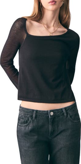Sheer sleeves and a cropped length shape the silhouette of this cotton-kissed top made with a sleek asymmetric neckline.