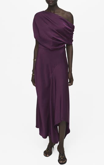 Rippled ruching adds texture and dimension to this shoulder-baring midi finished with a flowy asymmetric skirt.