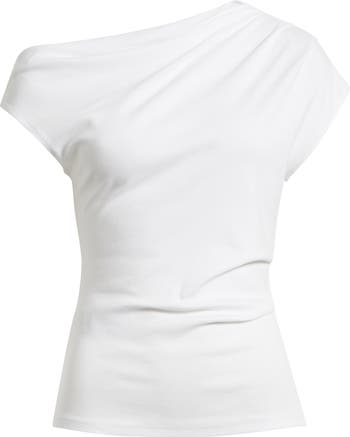 Soft gathers and a shoulder-baring silhoeutte create asymmetric intrigue for this stretch-cotton-blend top.