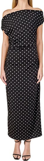 Side ruching accentuates the asymmetric silhouette of this polka dot-patterned dress that's destined to steal the scene.
