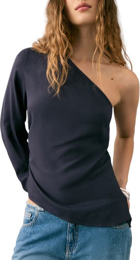 Trendy asymmetry defines this one-shoulder top that features a slanted neckline and single long sleeve.