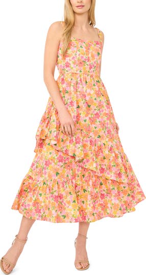 Delightful blooms brighten this sleeveless square-neck midi made with a layered ruffle skirt for graceful movement.
