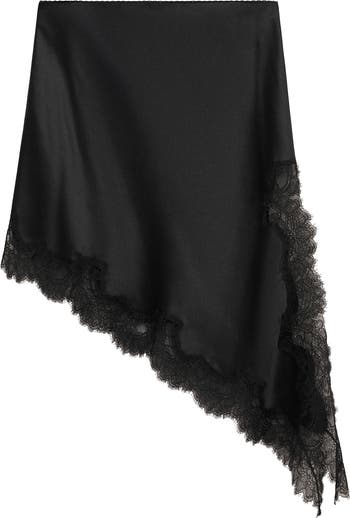This asymmetric satin skirt leans into an alluring, lingerie-inspired mood with its fluid drape and deep side slit. Eyelash lace trims the hem for a delicate finish, adding soft contrast and subtle texture to the contemporary silhouette.