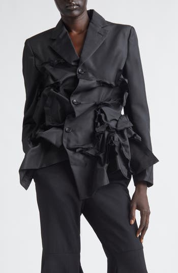 Rei Kawakubo deconstructs traditional tailoring through her typical avant-garde lens in this asymmetric gabardine blazer decorated with a sculptural cascade of raw-edged ruffles.