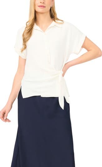 A front tie adds a playful finishing touch to this light and airy button-front shirt fashioned with a spread collar and cuffed sleeves.