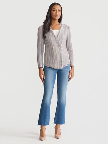 This asymmetrical fringe trim knit jacket delivers modern sophistication for spring work-to-evening occasions, blending tailored structure with refined texture. Designed with a sleek asymmetrical front, delicate fringe trim, and polished button accents, it creates a statement silhouette that transitions effortlessly from office hours to evening events. Perfect for spring celebrations, dinners, and elevated gatherings, this jacket offers luxury layering with versatile, season-ready appeal.